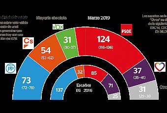 Estimación de voto.Si las elecciones generales tuviesen lugar hoy, cuatro semanas antes del 28-A, según resultados estimados en una encuesta electoral de Metroscopia, el PSOE sería el partido más votado, logrando entre 115 y 126 escaños (28,7% de los votos, 6 puntos más que en junio de 2016). La cifra final que en este momento parece más probable es 124; es decir, 39 escaños más de los que ahora tiene. A continuación, y a considerable distancia (casi diez puntos), quedaría El PP con un 19% de los votos (14 puntos menos que en 2016) conseguiría unos probables 73 escaños (64 menos que los que ganara hace casi tres años). Pese a este desplome, seguiría todavía por encima de las otras tres formaciones de ámbito estatal que parecen en condiciones de conseguir más del 10% de los votos. Ciudadanos en este momento se haría con 54 escaños (el 16.3% de los votos (que le supondrían en principio 54 escaños). Unidas Podemos, con el 14% de los votos y Vox, un 11,9 %, con 31 escaños.