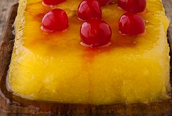 - En el molde escogido ponemos unas rodajas de piña (extras, a parte de la lata de la receta) en el fondo y disponemos la mezcla.