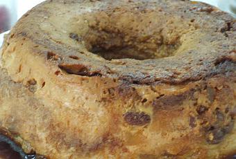 Para el almíbar, poner el azúcar en un cazito. Cuando esté caramelizado, apartar del fuego, dejar templar. Añadir el agua y volver a poner al fuego removiendo constantemente hasta disolver el caramelo. Añadir un poco de canela.Volcar el almíbar encima del puding y dejar que lo vaya absorbiendo.