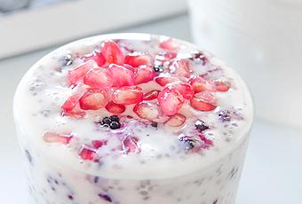 INGREDIENTES | 2 cucharadas de Chía, 1 taza de leche de almendra, 1 cucharada de miel, fruta al gusto.