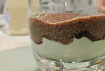 3 cdas de semillas de chía 1/4 de taza de cacao en polvo 3/4 de taza de leche o leche vegetal Estevia o endulzante al gusto 1 taza de yogur griego o alto en proteína 1-2 c/c de café instantáneo Estevia o endulzante al gusto Para preparar la capa de chía: