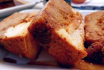 2.- Desmenuzamos el bizcocho, lo extendemos sobre el caramelo. Pelamos la manzana, la rociamos con el zumo de limón para que no se oxide. Disponemos los gajos de manzana sobre el bizcocho.En un bol ponemos el requesón con los huevos, el azúcar de vainilla y la canela. Batimos bien con la varilla de mano hasta que los ingredientes estén bien mezclados. Vertemos la masa de huevo y requesón sobre el molde.3.- Precalentampos el horno a 180º sin ventilador. Cocinamos el puding al baño maría 35 o 40 minutos hasta que el puding este hecho y dorado por fuera. Retiramos del horno, dejamos que se temple y lo guardamos en la nevera hasta el momento de servir.