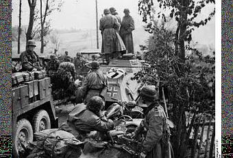 Unidad motorizada de las Waffen SS (Totenkopf) se preparan para el asalto en el sector de Leningrado. La swástika sobre el vehículo sirve para que los aviones de la Luftwaffe no lo confundan con el enemigo.