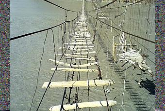 Se trata de un puente muy antiguo y deteriorado (le faltan muchos tablones de madera) y está situado a mucha altura de las aguas del lago. El puente parece ser la única vía que tienen los lugareños para llegar a las principales ciudades de la zona, por lo que suele estar bastante transitado. De hecho se trata de una de las mayores atracciones turística locales y atrae a los mas osados a vivir la emoción que supone cruzarlo.