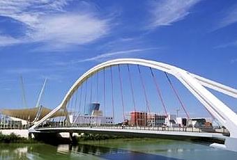 Entre los meses de abril y octubre de 1992 tuvo lugar en la ciudad de Sevilla la Exposición Universal, popularmente conocida como Expo 92, celebrada con motivo de la celebración del quinto centenario del descubrimiento de América. Para tal evento, se habilitó la isla de la Cartuja, terreno acotado por el río Guadalquivir, la corta de la Cartuja y el puente de Chapina, en la que construyeron los pabellones a los acudieron millones de visitantes. La isla fue conectada con la ciudad de Sevilla, que sufrió una profunda remodelación urbana, mediante seis nuevos puentes. En la imagen, uno de ellos, quizá el más emblemático, denominado puente de la Barqueta.