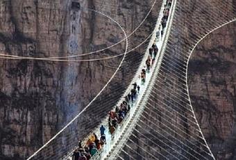 Construido por la firma Bailu Group, el puente suspendido de cristal recibió a unos 3.000 turistas el dia de su apertura, siendo las primeras personas en vivir la vertiginosa aventura de caminarlo.