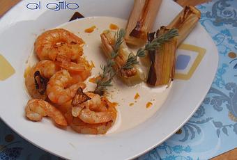 Para servir, ponemos en una fuente la salsa por debajo, y encima los puerros asados y los langostinos, que habremos escurrido del aceite en el que se han hecho.