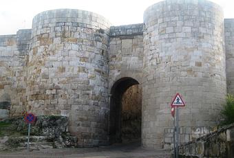Vista frontal de la Puerta de Doña Urraca desde el exterior,mostrando los torreones semicurvos y el arco de medio punto