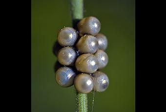 "Una serie de huevos con aspecto de barriletes dispuestos alrededor de la vegetación herbácea, nos indica que se trata de la puesta de una chinche."
