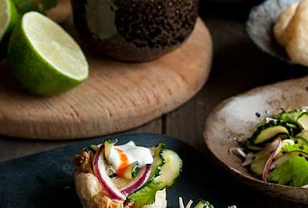 - Coloca el pulled pork sobre la corteza de cerdo seguido de la ensalada de pepino.