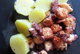 Elaboración Pelamos la cebolla y la introducimos en una olla con abundante agua. La ponemos a fuego y, en cuanto hierva, cogemos el pulpo y procedemos a “asustarlo”. Esto consiste en introducir y sacar el pulpo del agua hirviendo unas tres veces. Al hacerlo comprobaremos cómo se encoge de ahí que a esta acción se la denomine “asustar al pulpo”. Lo dejamos cociendo durante unos 40 minutos aproximadamente. El tiempo total de cocción dependerá del tamaño del pulpo, menos tiempo cuanto más pequeño sea y viceversa. Comprobaremos que está cocido pinchándolo con un palillo. Cuando creamos que está listo, lo sacamos del agua y lo escurrimos bien. Después procedemos a cortarlo en rodajas. Podemos agregar también la cabeza del pulpo, por eso es muy importante la limpieza previa del mismo, incluso dándole la vuelta para limpiarla por dentro, pero eso ya es cuestión de gustos. En casa solemos reservarla para hacer otros platos que ya os comentaré en otra ocasión.Pelamos y cortamos las patatas en rodajas y las ponemos a cocer en otra olla con sal. En algunos sitios utilizan el agua de cocer el pulpo para cocinar las patatas. Esto le da un sabor a pulpo increíble además de un colorcito espectacular. En esta ocasión, y como en casa son bastante raritos en este sentido y les gusta que las patatas tengan su color natural, las he cocido en agua limpia, desechando el agua de cocer el pulpo.
