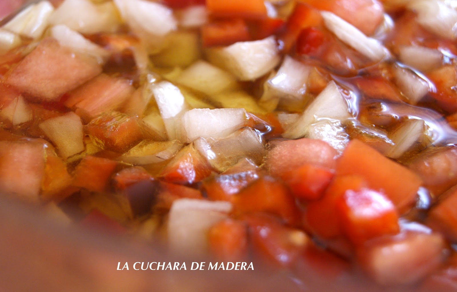 Lavamos , pelamos y picamos la cebolla, el pimiento , el tomate, y lo agregamos a la vinagreta; así mientras se hace el pulpo se va macerando los componentes