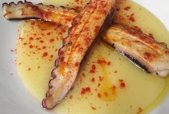 Emplatamos la crema de patata en plato hondo y disponemos los tentáculos de pulpo ya planchados por encima. Para terminar decoramos con pimentón y regamos con un generoso chorro de AOVE, como si de un "pulpo á feira" se tratase.