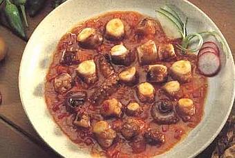 ELABORACIÓN: En una cacerola hacer un sofrito con la cebolla y el pimiento morrón picados muy menudos. Añadirle el pulpo. Verter el vino blanco seco y 2 cucharadas de concentrado de tomate, o los tomates troceados sin piel ni pepitas. Cocer a fuego lento y tapando la cacerola.