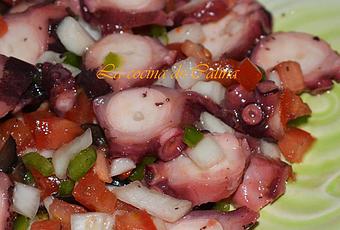 Otra forma de presentar el pulpo, es acompañado de verdura finamente picada a la que le añadiremos una vinagreta, así tenemos una mezcla de sabores muy agradables al paladar.Ingredientes: