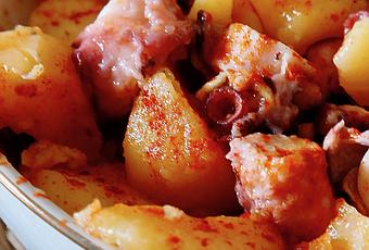 3. Echamos las patatas escurridas en la fuente, troceamos el pulpo por encima, espolvoreamos el ajo picado, el pimentón, y el aceite de oliva.