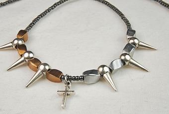 Y seguimos mostrandoos nuevos modelos de nuestra serie Baby Punk.En esta ocasión con dos nuevos collares tipo gargantilla con pequeñísimos crucifijos y pinchos plateados, acompañados de cuentas de cerámica esmaltada en preciosos colores irisados y, en la primera, con mini cuentas de grafito.Más comedidos que en etapas anteriores, son ideales para lucirlos solos o acompañados de otros que ya tengáis del mismo estilo o, rompiendo el estilo, podéis mezclarlos con otros más románticos, con mariposas o corazones, en los tres casos quedarán preciosos en vuestro cuello y le darán ese toque personal a un look serio.Ya los tenéis disponibles en nuestra tienda on line.***