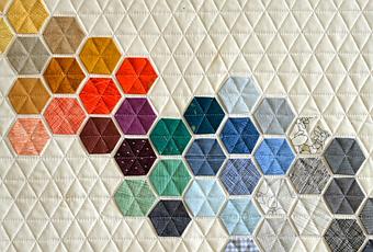 Original quilt acolchado sobre blanco con hexágonos aplicados de Modern Handcraft.