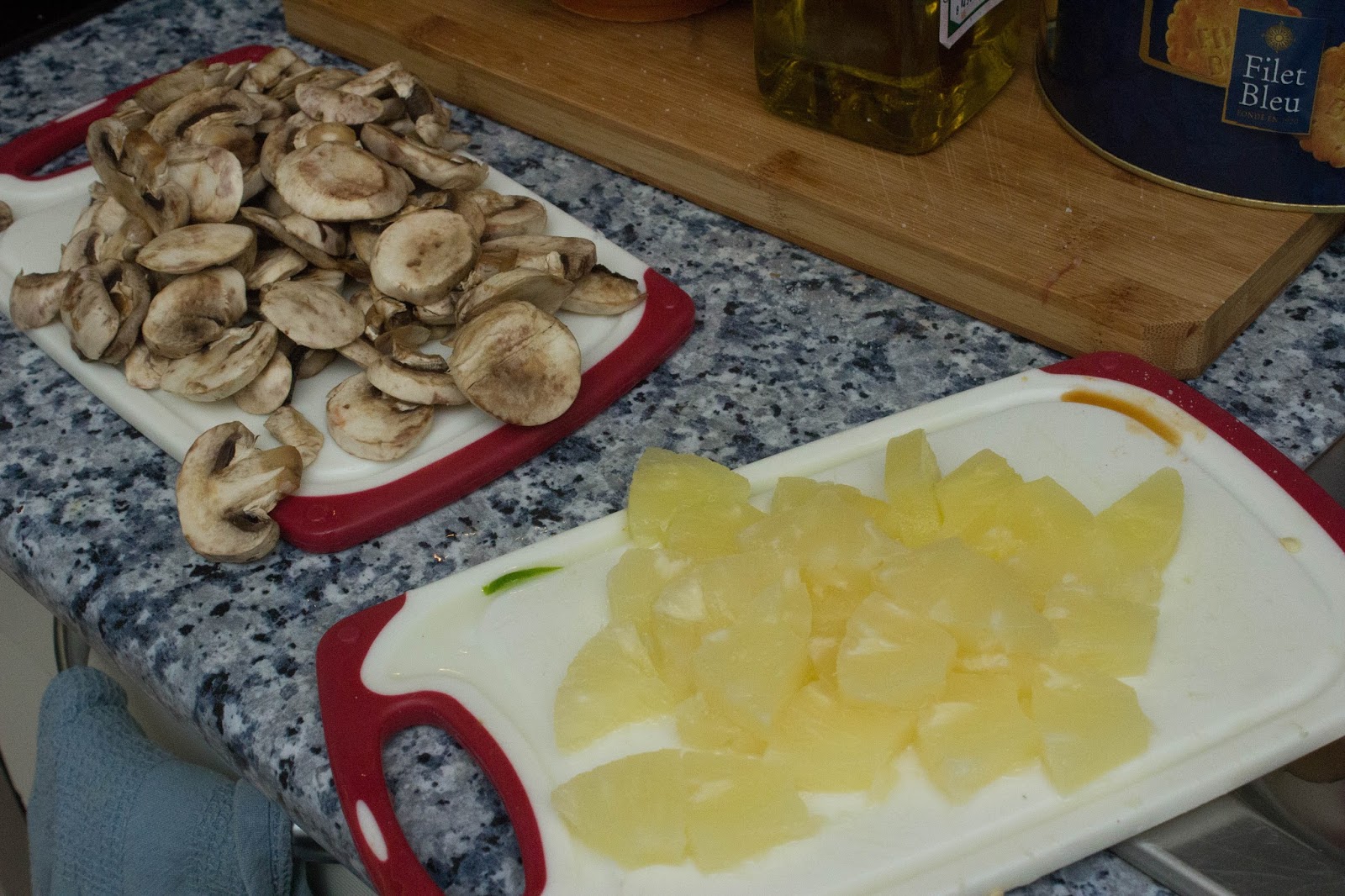 Cortar la piña en trocitos y lavar y laminar los champiñones, reservar ambas cosas.