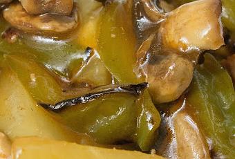 Cortar en juliana los pimientos verdes, ponerlos en la sartén donde se doró la carne que habremos reservado en un bol. Hacerlos con un poco de aceite hasta que se dore.