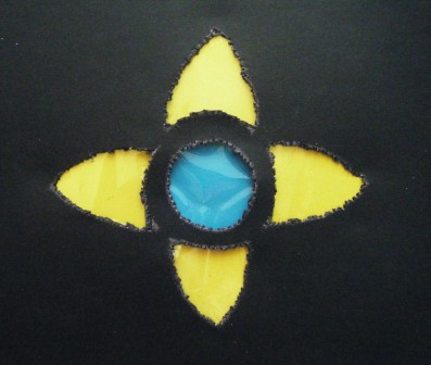 3.-Cortar el papel celofán en cuadrados del tamaño de las formas desprendidas, poner goma en la cartulina negra y pegarlos.