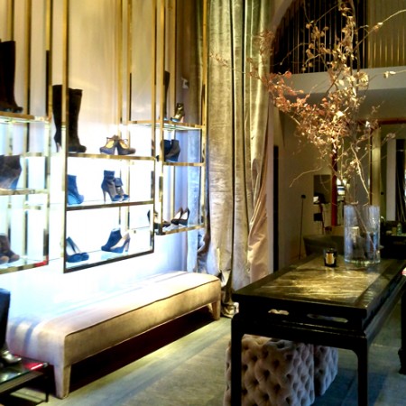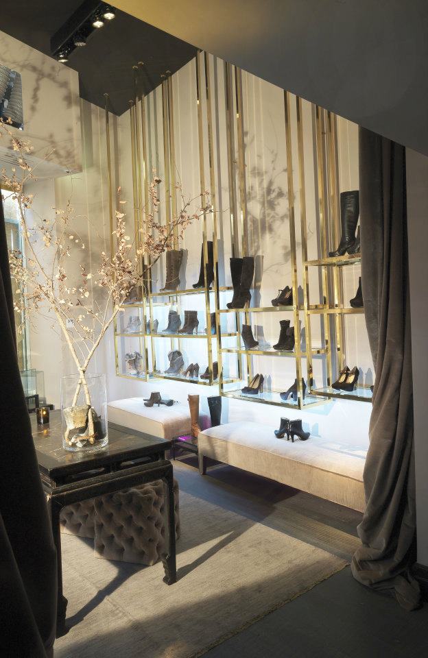 Volviendo al proyecto, del que desconozco su autor, comentar la maravillosa entrada con los estantes con tubos dorados suspendidos desde techo, esa mesa central de madera con sobre en mármol...un lugar donde comprar zapatos se convierte en todo un placer.