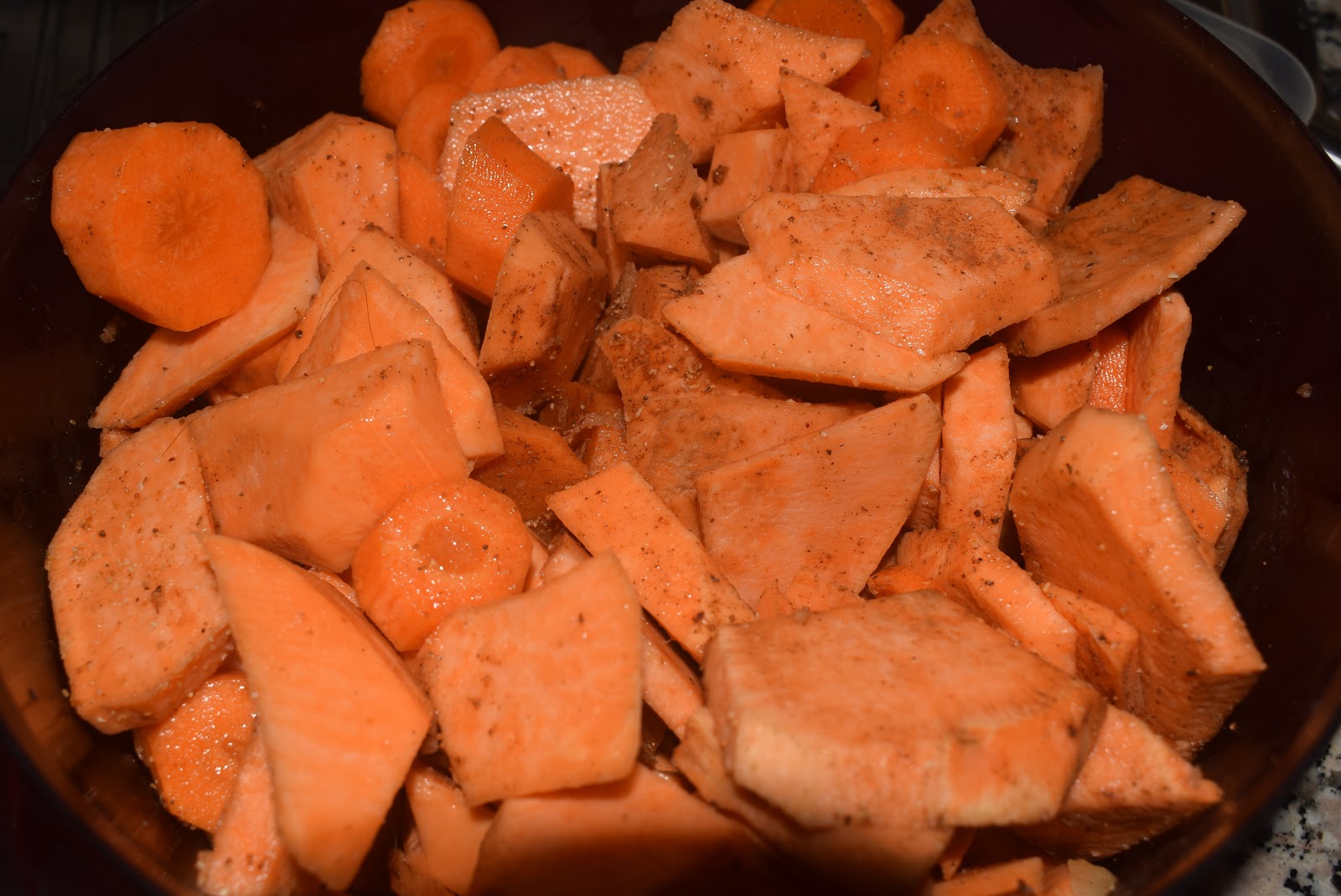PREPARACIÓNTrocea el boniato en trozos pequeños, pela y corta las zanahorias en rodajas finas. Ponlo todo en un recipiente apto para el microondas, añade el resto de ingredientes menos el AOVE. Remueve bien e introduce en el microondas tapado con su tapadera o con papel transparente. Así se cocinará al vapor. Programa 10 minutos a máxima potencia. Espera un par de minutos antes de abrir la puerta del horno, remueve y programa 3 minutos más ( en mi caso sí, dependerá de la dureza de tus ingredientes) a igual potencia.
