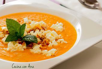 Servir bien caliente acompañado del queso feta desmenuzado, cebolla deshidratada y dados de pan frito.