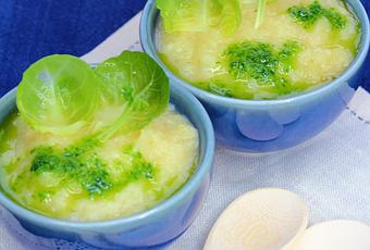 - Servir el puré en cuencos, decorar con el aceite al ajo y al perejil y unas hojas de coles de Bruselas ligeramente cocidas al vapor (5-10 minutos).
