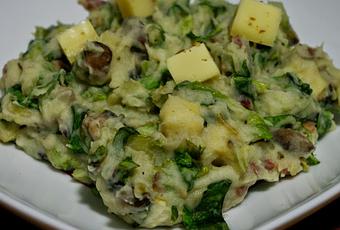 Ingredientes: 1,5 kg patatas; 250 g champiñones; 50 g mantequilla; 200 g panceta; 150 ml leche; 600 g escarola; 200 g queso de comino; sal; pimienta; nuez moscada.