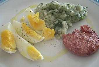 Repito, que este puré es una excelente guarnición para un plato fuerte, o como plato principal para el desayuno o la cena.