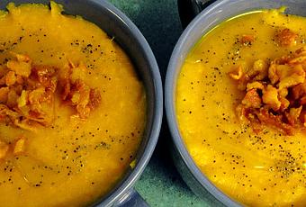 Ponemos el puré en los platos o cuencos donde vayamos a servirlo. Para decorar, en una sartén sin engrasar tostamos dos lonchas de bacon picadas finamente, hasta que los trocitos de bacon queden crujientes. Repartimos el bacon en los cuencos y terminamos de decorar el plato con un chorrito de AOVE crudo y espolvoreando semillas de amapola.