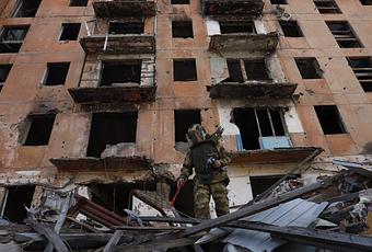 Un experto ruso en explosivos inspecciona un edificio destruido en Mariupol, en la Ucrania controlada por Rusia. Un informe publicado en junio decía que las fuerzas rusas utilizaron tácticas de hambre en su asedio de la ciudad portuaria del sur en 2022.