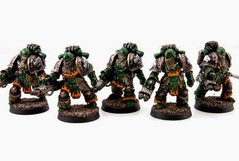 Las figuras me gustan,por tres motivos.Una son las Mk II o Mk III modificadas a "Mantos de Ceniza" que llevan,con los yelmos con crestas como si fueran lagartos y esos "velos" de piel escamosa que cubren el frontal,que me recuerda a las protecciones faciales de malla que usaban los escandinavos en la edad media para protegerse el rostro de cortes y de astillas que saltasen de sus escudos o de los de sus enemigos y les hirieran la cara.Algo así se hace aquí,pero con el fuego.Ademas,la decoración de las armaduras con los típicos motivos de los Salamandras esta muy bien(Igual el tema de las llamas un poco grande,como mucho,pero tampoco lo veo molesto)Otra es el detalle de que las armas se empuñen en usa sola mano,dejando la otra libro.Y finalmente el tema de los depósitos fijados a los generador dorsal y conectados al arma,pese a que esta tiene otros por debajo.Yo a mis marines de plaga les hice unos lanzallamas con una idea por el estilo,para dar un aspecto mas arcaico y duro que pegara con sus cascos con pinchos.Y el ver esta similitud con esas figuras de FW me ha gustado.El pintado de las miniaturas esta bien,pero no tanto como otras veces.Aun así son figuras excelentes.