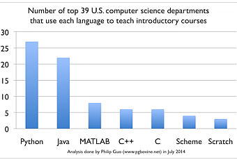 El estudio lo ha llevado a cabo la organización ACM y muestra que en 27 de las 39 primeras universidades estadounidenses (el 69%) se enseña Python en alguno de sus dos primeros cursos. Entre ellas están el MIT, Austin-Texas, California-Berkeley, Columbia o Virginia Tech. Eso sí, entre las 12 que no también hay importantes como Stanford o Harvard. Esto hace que Python sea el lenguaje más utilizado en estas prestigiosas instituciones por encima de Java, Matlab (el principal lenguaje científico), el binomio C/C++ o, mira tú por donde, Scratch. Curiosamente lenguajes tan populares como Javascript o PHP no son muy usados en estos menesteres introductorios, aunque no deja de tener su lógica dado lo caóticos que pueden llegar a resultar.