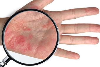 Dermatitis de mano, también conocida como eccema de la mano, es una condición que inicialmente hace que la piel se agriete, se vuelva roja y seca, luego progresa a golpes y ampollas acuosas. Éstos ocurren generalmente en racimos, aparecen en las palmas y los lados de los dedos. Ocasionalmente, estos también pueden afectar las plantas de los pies. Estas ampollas pican y a veces, incluso son dolorosas. Pueden repetirse con frecuencia, durando aproximadamente tres semanas cada vez.