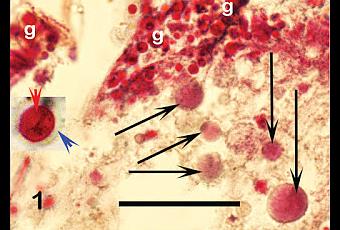 Figure 1. Eukoenenia spelaea – gut with food (large cells, indicated by black arrows). Red arrowhead = plated cyanobacteria in cave substrate (inset), blue arrowheads = glycocalyx. Stained with Masson’s trichrome. Abbreviation: g glycogen deposits. Scale bar: 0.02 mm.