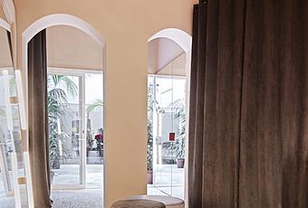 En este interiorismo realizado por el estudio Cirera+Espinet,en la distribución del espacio, dibujando en el suelo formas que combinan las líneas rectas con las curvas, buscando la imperfección y alterando la geometría de este local tan rectilíneo.Las cortinas se confeccionaron con ollados metálicos negros acorde con la barra semicircular de hierro , y los pufs se diseñaron redondos para romper con el espacio rectilíneo de la tienda, el resultado es una tienda acogedora.