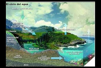 La circulación del agua en los ecosistemas se produce a través de un ciclo que consiste en la evaporación o transpiración, la precipitación y el desplazamiento hacia el mar.