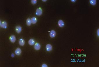 - - una señal Azul correspondiente al cromosoma 18 - - una Roja (cromosoma X) o Verde (cromosoma Y) en función de que cromosoma sexual esté presente.
