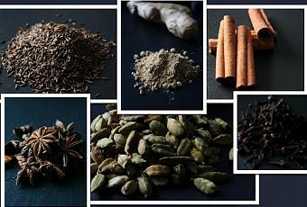 El garama masala está compuesto pricipalmente de canela en rama, semillas de cilantro, cardomomo verde, pimienta negra, jengibre en polvo, anìs estrellado, clavos y cominos.