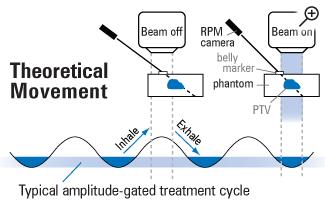 El "gating" además permite a los clínicos correlacionar la posición del tumor en relación con el ciclo respiratorio del paciente. Se utiliza para ello una cámara de seguimiento de infrarrojos y un marcador reflectante. El sistema mide el patrón y el rango de movimiento respiratorio del paciente y los muestra con una forma de onda. Los umbrales de activación periódica se establecen cuando el tumor está en la parte deseada del ciclo respiratorio. Estos umbrales determinan cuándo el sistema de "gating" debe encenderse y cuándo apagarse.