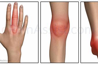 Los tejidos cerca de las articulaciones pueden inflamarse y aparecer nódulos subcutáneos, ósea bultos dolorosos debajo de la piel, cerca de los codos, las rodillas, las muñecas o principalmente de los dedos, también puede haber placas eritematosas elevadas, dolorosas, que aparecen y desaparecen súbitamente con una duración similar a los ataques.