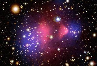 Por lo tanto, necesitamos más gravedad para explicar cómo las galaxias rotan y permanecen unidas, lo que implica que debe existir más masa de la que podemos observar, y por tanto invocar la existencia de la materia oscura. La materia oscura también ayuda a explicar por qué los grupos de galaxias permanecen unidos y explica los efectos a gran escala grande de lente gravitacional, como puede verse en el Cúmulo Bala (foto de arriba).