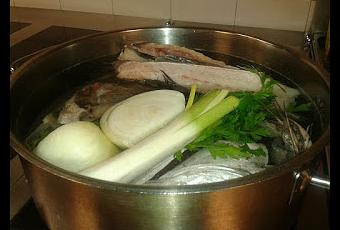 PREPARATION:We wash the heads and thorns well to remove the gills and eyes from the head of the fish, that we are left without any impuresa.In a very hot pot fry the onion, fennel, celery and garlic clove. Deglaze with the white wine, let evaporate a third of its volume.Add the head and the cuts of the spine. Mix.Add water, garni bouquet, sachet d 'épices and garlic. Once it starts to boil lower the heat and cook for 1 hour. It must be well concentrated.During the cooking of the broth remove with a skimmer the impurities accumulated on the surface. (The foam that accumulates in the top of the broth).Once ready to remove from the fire. Rest and strain for a Chinese, sieve or cloth to be as clean as possible. Let cool to freeze. A convenient option when using a little of this broth for other preparations is to freeze it in ice cubes and so we only use the squares to be used.