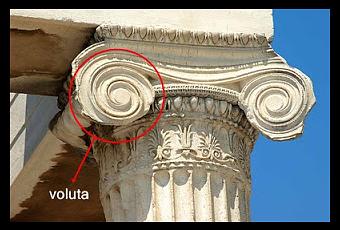 Voluta: motivo decorativo en forma de espiral. Constituye un elemento característico del capital de orden jónico. Se ha sugerido que este motivo decorativo estaba inspirado en la curva de los cuernos de los carneros o en la concha de los caracoles, o simplemente un origen geométrico.