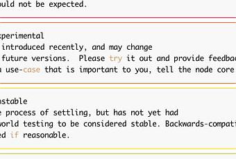 Otra desventaja importante nodo es que es todavía en las primeras etapas de desarrollo, lo que significa algunas características pueden cambiar según avanza el desarrollo. De hecho, si nos fijamos en la documentación , que incluye un índice de estabilidad, que muestra cómo el uso riesgoso de cada función está actualmente.![¿Qué es Node.JS y por qué debo cuidar? Imagen [Desarrollo Web] ¿Qué es la estabilidad Node.JS y por qué me debe importar? [Desarrollo Web]](http://m1.paperblog.com/i/262/2625909/que-es-que-sirve-nodejs-L-RjuLi2.jpeg)