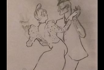 En el siguiente dibujo al carboncillo, Lautrec describe a una pareja bailando. Con su trazo gracioso e irónico, como gran caricaturista que era, nos expresa el movimiento de la pareja bailando, el contoneo de las caderas de la mujer. Estamos probablemente en el Folies Bergères. Gracia y expresividad de la línea, feminidad del movimiento y cierta elegancia del bailarín...cuánto sugiere Lautrec con casi nada. Una delicia.