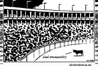 Un año más, los habitantes de este pueblo de Valladolid, al que no iré nunca hasta que aprendan a comportarse como seres humanos, han retado la conciencia colectiva. Si un mundo mejor es posible, éste no será en Tordesillas. Un año más, han matado a lanzazos a otro toro. Ufano, feliz, cansado, el joven (¡joven!, ¿qué futuro nos espera con jóvenes así?), que debe ser uno de los cinco millones de españoles que no han salido nunca de su provincia y así nos va, ha matado a un noble animal en una conjura de necios maquillada de fiesta.