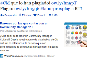 Plan A. Campaña en redes sociales. Con este tuit y el hashtag #laborprexplagia el objetivo era denunciar a esa "acreditada entidad" el plagio de contenidos que habían realizado en su blog.